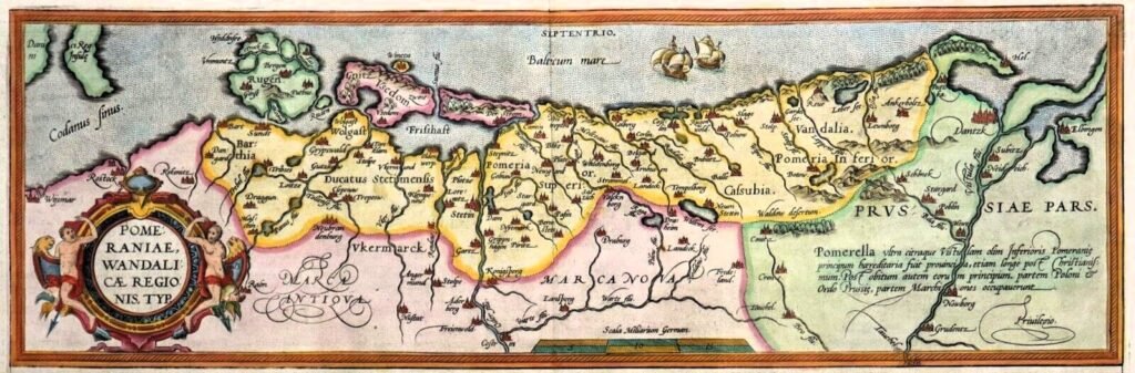 La Poméranie (Pomerania en anglais, Pomorze en polonais) est une région historique située sur la côte sud de la mer Baltique, aujourd’hui partagée entre l’Allemagne (à l’ouest) et la Pologne (à l’est). Son nom dérive du slave ancien “po more”, signifiant “terre au bord de la mer”. Son histoire remonte à plus de 10 000 ans, marquée par des migrations, des conquêtes et des divisions territoriales. La région est habitée depuis la fin de la dernière ère glaciaire. Durant l’Antiquité, elle est peuplée par des tribus germaniques et baltiques, mentionnée comme partie de la “Germania” par les Romains. À partir du VIe siècle, des peuples slaves (comme les Poméraniens) s’y installent, repoussant ou assimilant les populations précédentes.
