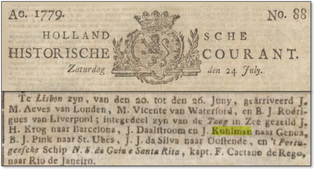 De la fin des années 1750 jusqu’à 1780 environ, Johan Kuhlman (1738-1806) a beaucoup voyagé, à la recherche de nouveaux produits à importer en Suède ou encore pour se soigner (2). Quand on épluche les principaux journaux de cette époque on retrouve des traces de ses passages dans les différents ports d’Europe. Johan ira jusqu’à Setubal, le port de Lisbonne ou encore Gènes en Italie.