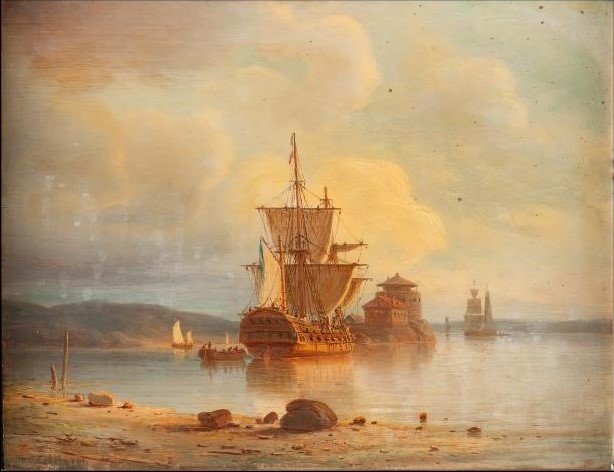 Un navire de la Compagnie des Indes Orientales au mouillage devant Dalarö, les voiles déliées pour le séchage, mâts avant et arrière abaissés. Drapeau suédois sous la fourche. Cedergren (1), Per Wilhelm (1823 – 1896)