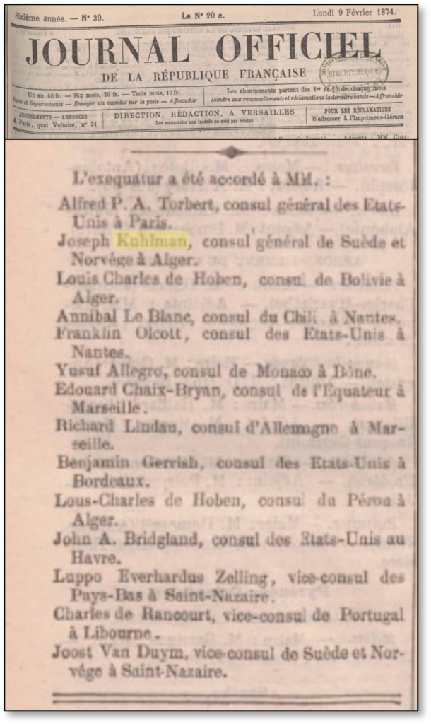 La liste des titulaires du poste d’Alger permet d’illustrer concrètement cette histoire administrative : elle mentionne notamment Joseph Kuhlman, en fonctions à partir de 1873 et jusqu’à son décès en août 1876. L’annuaire du corps diplomatique et des consulats étrangers confirme par ailleurs ce maillage, en listant, à côté de la légation parisienne, des postes consulaires en France et en Algérie, et en indiquant « Alger — M. Kuhlman (Joseph), consul général ». Un élément complète utilement cette lecture : l’exequatur. Dans la pratique du XIXe siècle, un consul nommé par un État étranger ne pouvait exercer pleinement dans le pays (ou sur un territoire) où il était affecté qu’après reconnaissance par les autorités locales. Cette reconnaissance prend la forme de l’exequatur, souvent publié dans les documents officiels. Dans le Journal officiel de la République française du 9 février 1874, figure ainsi la mention : « L’exequatur a été accordé à M. Joseph Kuhlman, consul général de Suède et Norvège à Alger », ce qui atteste la reconnaissance formelle de ses fonctions par les autorités françaises.