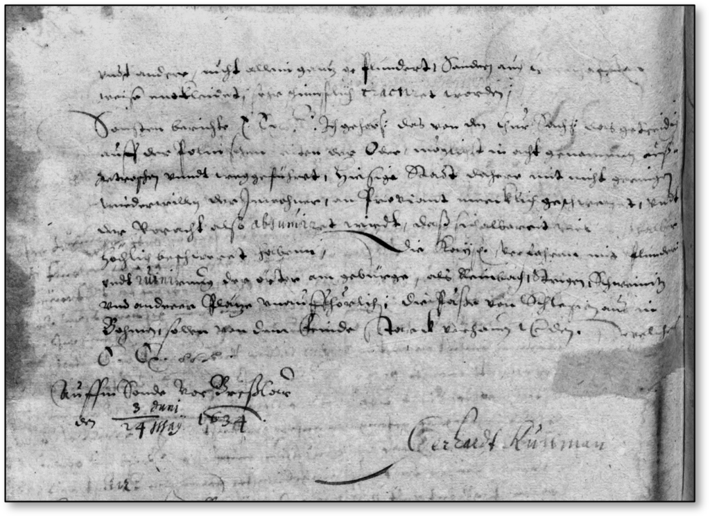 Plateau en face de Breβlow, le 3 juin/24 mai 1634 » Signé Gerhard Kuhlman.