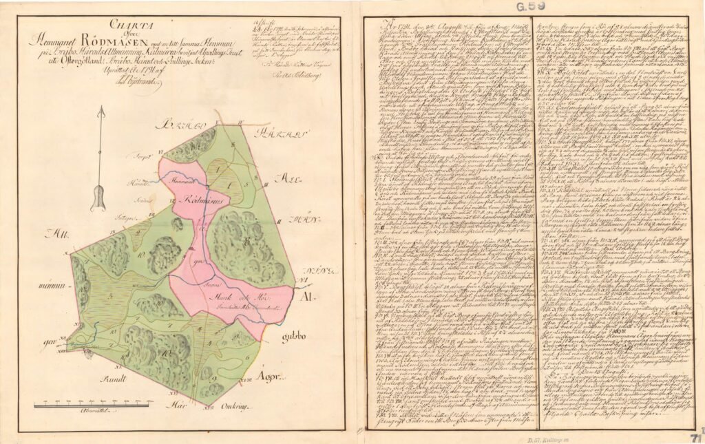 Références : Nystrand, Joh., Charta öfver Hemmanet Rödmåsen med en till samma Hemman på Bråbo Härads Allmänning Kolmården belägat Upodlings-Tract, uti Östergötland, Bråbo Härad och Kvillinge Socken, Rödmossen, 24 août 1791. Akt D57-71:1 — LMA (Lantmäterimyndigheternas arkiv), Östergötland, Norrköping. Transcription et traduction intégrales réalisées d’après les 11 pages zoomées du document original, mars 2026.