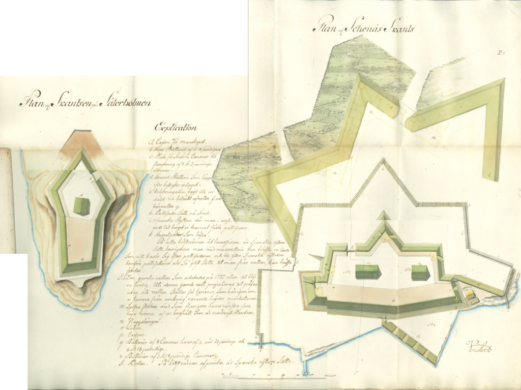 En réaction directe à l’invasion de 1719, des mesures furent prises sans délai. En juillet 1720, après plusieurs rappels, le capitaine des fortifications (fortifikationskapten) Ph. Nordencreutz⁵ fut convoqué pour reconnaître une installation défensive à l’entrée de Norrköping. Soutenu par les autorités de la ville, il lança les travaux de construction d’une redoute. En septembre 1720, le maître d’œuvre (byggmästare) Lars Gilberg⁶ fut nommé pour poursuivre les travaux que Nordencreutz avait commencés. Selon les plans de Nordencreutz, la redoute devait être construite sur Ängsudden, au niveau de Skenäs incendié, avec des positions pour l’artillerie également dans le chenal. Les travaux se poursuivirent en 1721, mais la redoute ne fut jamais pleinement achevée. Néanmoins, une redoute fut construite en 1720–1721 sur l’île de Säterholmen, juste à côté de l’embarcadère du ferry (färjbryggan), et une autre à Skenäs (Skänäs). Ensemble, ces deux ouvrages pouvaient croiser leurs feux (korsande eld) au-dessus de Bråviken pour interdire tout passage ennemi. Il est probable que la redoute de Skenäs ait été bâtie sur une fortification antérieure contrairement à celle de Säterholmen qui était une création entièrement nouvelle. Cette dernière était encore fortifiée au XXe siècle, témoignant de sa valeur stratégique durable.