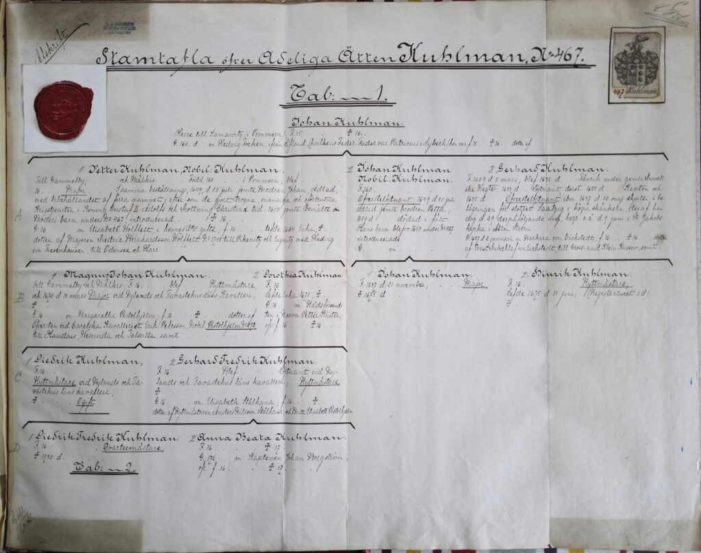Pendant longtemps, il me manqua un chaînon essentiel entre la fin de l’histoire de Johan Kuhlman (1600–1649) en Ingrie et la naissance de Heinrich fils à Gadebusch en 1693. Je ne disposais alors que de quelques textes parcellaires, parfois contradictoires, qui se mêlaient confusément à l’histoire des Kuhlman de Finlande. Ce n’est qu’en décembre 2025, avec la découverte de l’acte nobiliaire, que je pus enfin confirmer certains liens et démêler les fils de cette généalogie complexe. Auparavant, en analysant les actes de baptême des fils de Heinrich (1693–1765) à Norrköping, j’avais remarqué qu’un certain Joachim Adolf Kuhlman et une Magdalena de Besche figuraient comme parrain et marraine sur l’acte de baptême de Henrik (1731–1771) — lui-même père de Johan Peter (1767–1839) et grand-père de Josef (1809–1876). J’en avais déduit que Joachim Adolf était vraisemblablement un frère ou un cousin de Heinrich, sans pouvoir aller plus loin. C’est finalement l’ensemble de ces documents, réunis et croisés, qui me permit de comprendre et de reconstituer la véritable filiation.