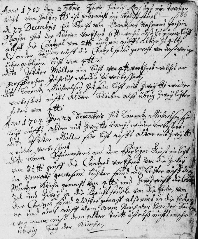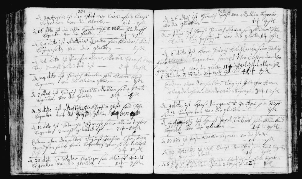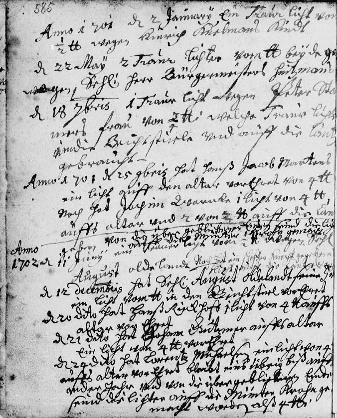 L’ascension civique d’Heinrich Kuhlman est attestée par les registres paroissiaux de la ville. Les Kirchliche Nachrichten de 1703 à 1719 mentionnent son nom à plusieurs reprises, associé à des dons de cierges de deuil (Traner Lichter) à l’église, une pratique caractéristique des notables de l’époque luthérienne, par laquelle un homme de rang affirmait publiquement sa piété et sa place au sein de la communauté. Ces entrées, modestes dans leur contenu, n’en constituent pas moins la seule preuve documentaire tangible de sa fonction de Bürgermeister : c’est là, dans la sobriété de ces lignes comptables, que son titre apparaît noir sur blanc, gravé dans l’encre des registres d’église de Gadebusch.