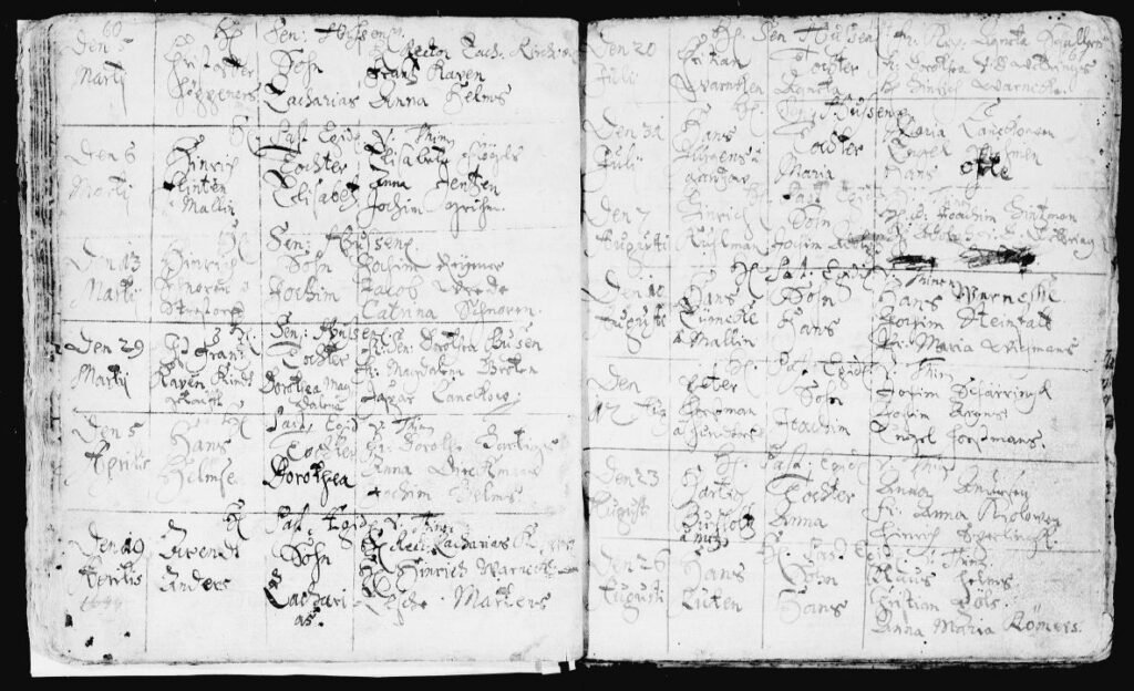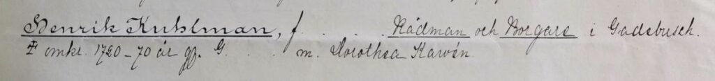 Nous avons évoqué dans une première partie la richesse de son parcours militaire. Avant de s’établir à Gadebusch, Heinrich Kuhlman accomplit en effet un long et remarquable itinéraire, qui le mène de la Finlande aux rivages de la Baltique, puis à Lübeck et enfin au Mecklembourg. Ce sont les archives militaires suédoises du Krigsarkivet et l’étude fondatrice d’Henrik Borgström (Genos, 1953) qui éclairent cette première partie de sa vie, une période jusqu’alors ignorée des généalogies de la famille. C’est à Gadebusch qu’il choisit de s’installer et fonder une famille. Il s’y établit comme bourgeois (Borgare), avant d’accéder successivement aux dignités de Rådman (Conseiller municipal) puis de Bürgermeister (Bourgmestre).