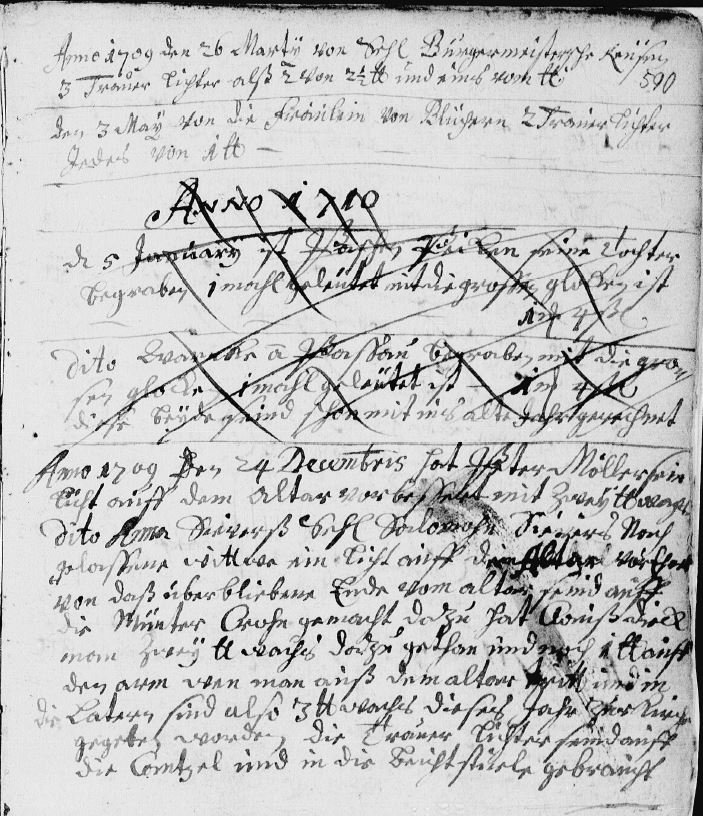 Page 9 : « En l’an 1709, le 26 mars : de la part de Son Honneur Madame la Bourgmesterin Kuhlman, 2 cierges de deuil… » . Ici le titre est au féminin — il s’agit donc de Dorothea Rawen, l’épouse d’Heinrich, désignée par le titre de son mari.
